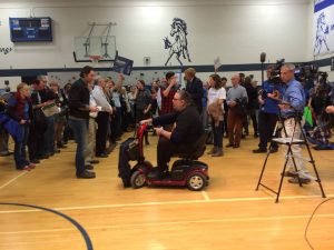 Iowa caucus goers stand to be counted. Action of great interest to media. Photo courtesy of Robin Fortney